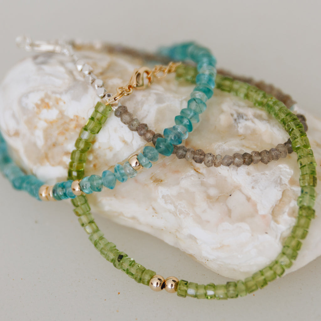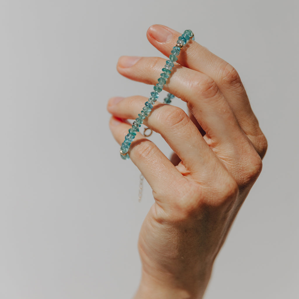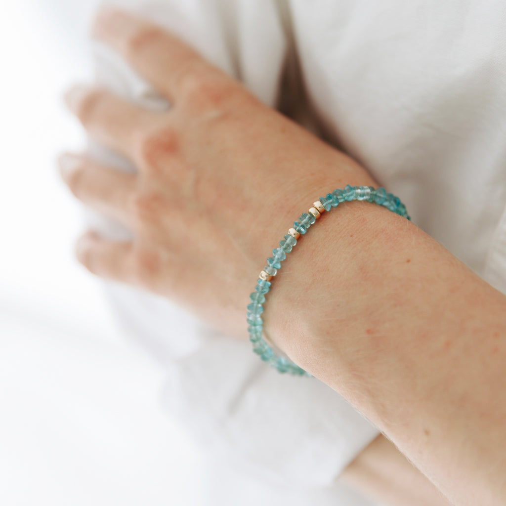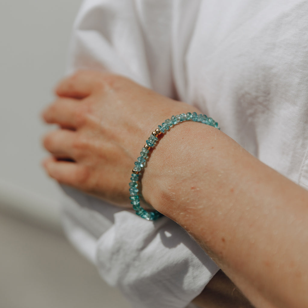 This blue-green Apatite bracelet is handcrafted to adore ocean-inspired shades. The bracelet is made with high-quality crystals 4-5 mm in size alternated with 14K Gold Filled beads.