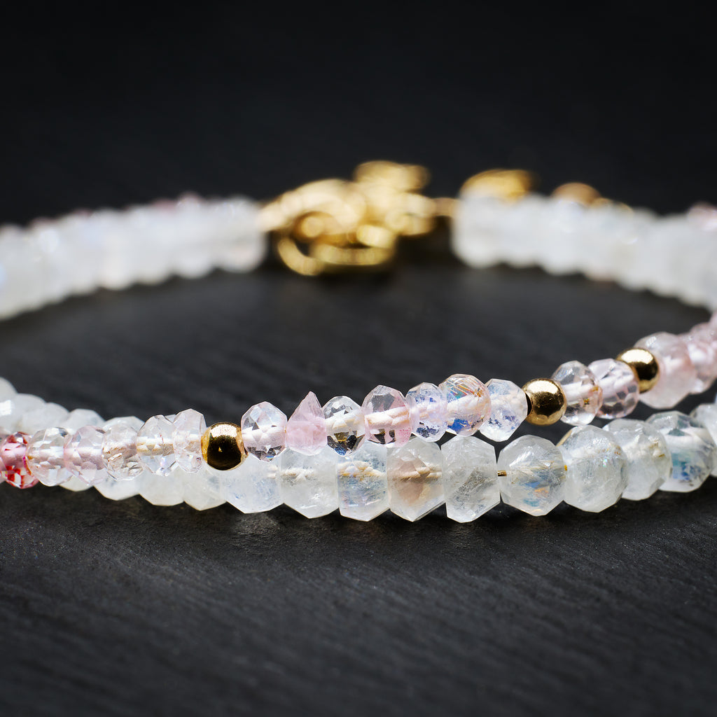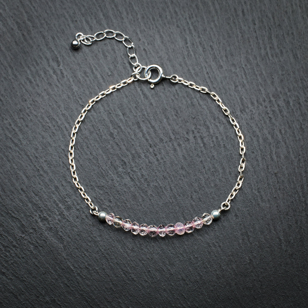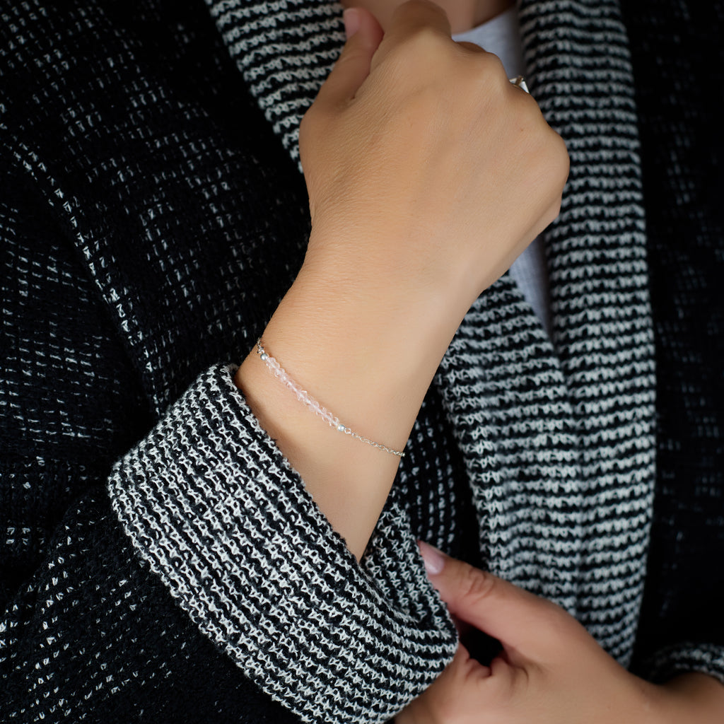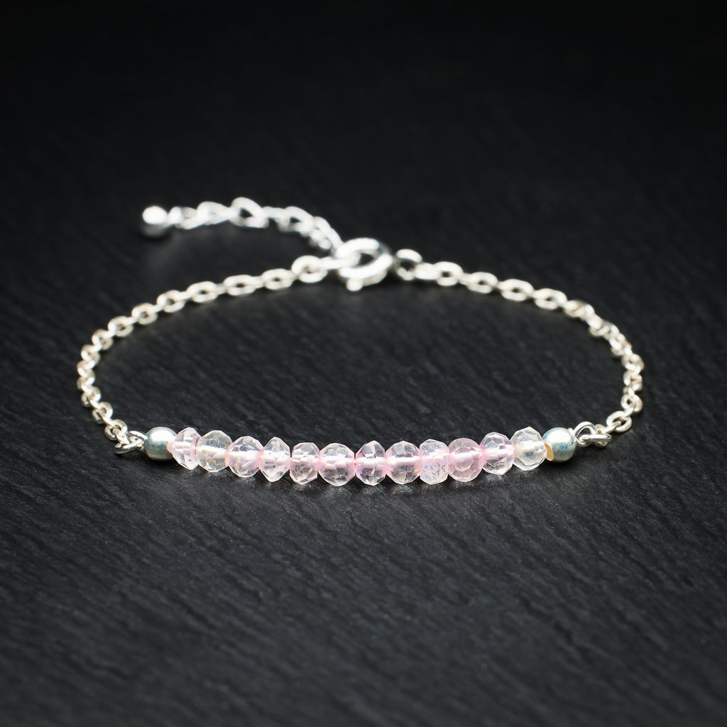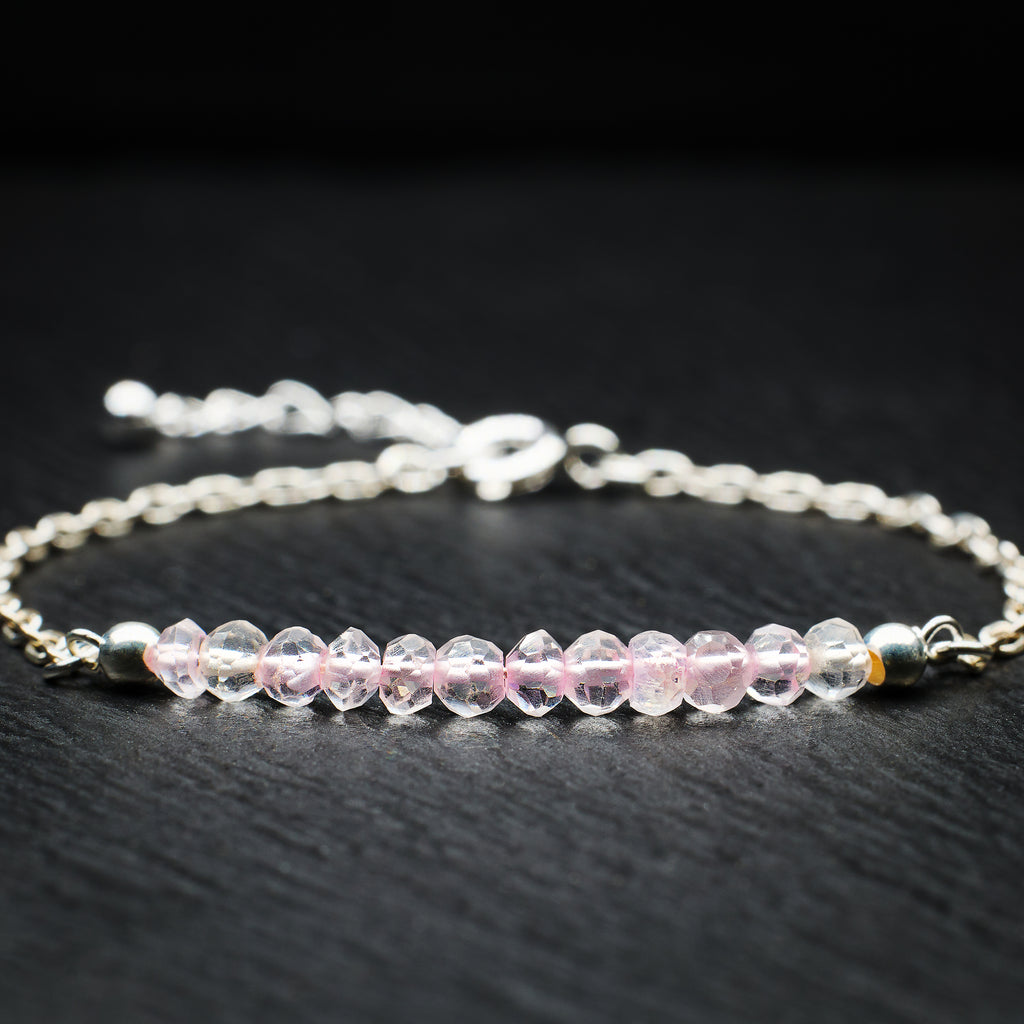 The dainty elegant Rose Quartz stackable bracelet is made of genuine AAA Grade Rose Quartz faceted 4 mm beads attached to a 925 Sterling Silver gentle but sturdy chain. Perfect for layering with other bracelets from your collection!