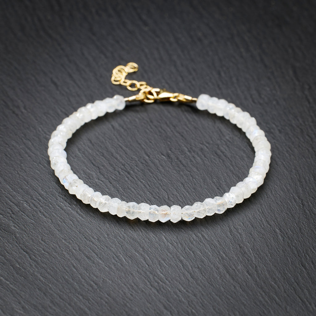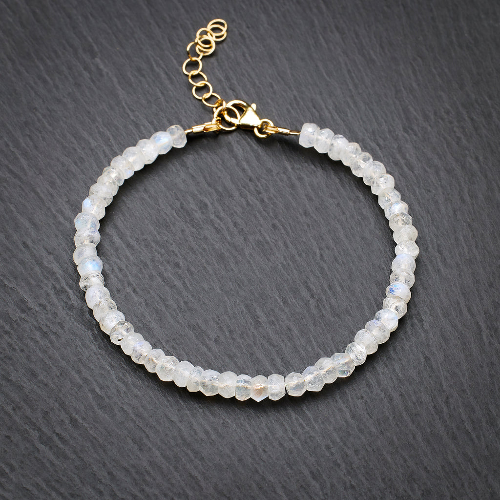 This dainty bracelet features genuine AAA Grade Blue Moonstone crystals attached to the 925 Sterling Silver chain. The crystals are genuine round Blue Moonstones about 5mm in size with internal glow and flashes of blue color.