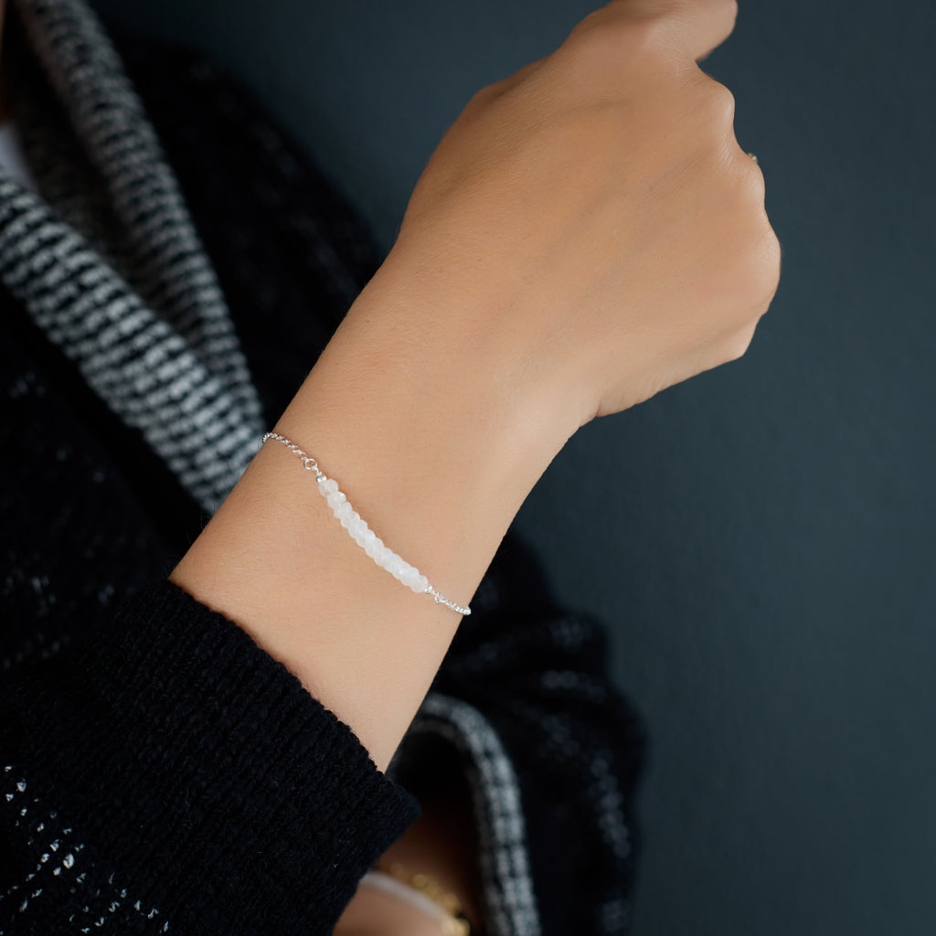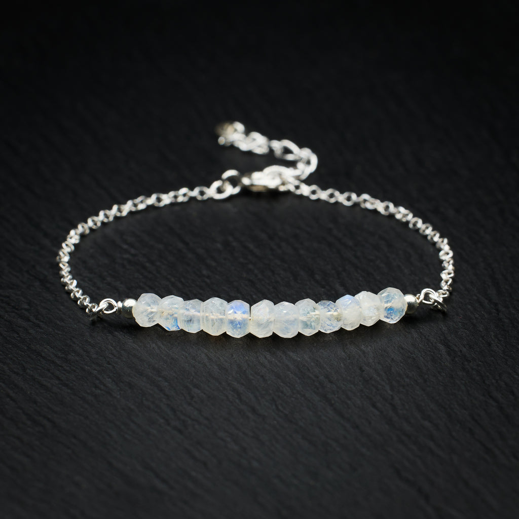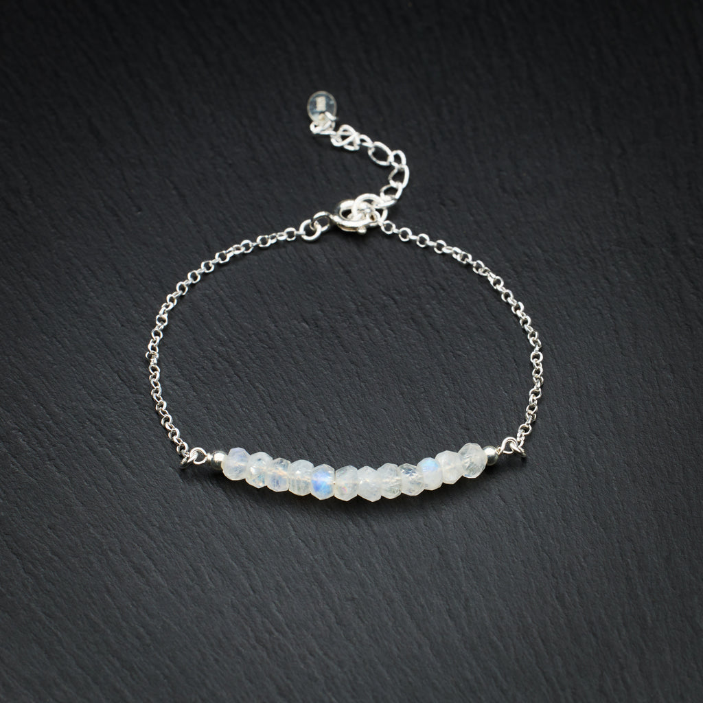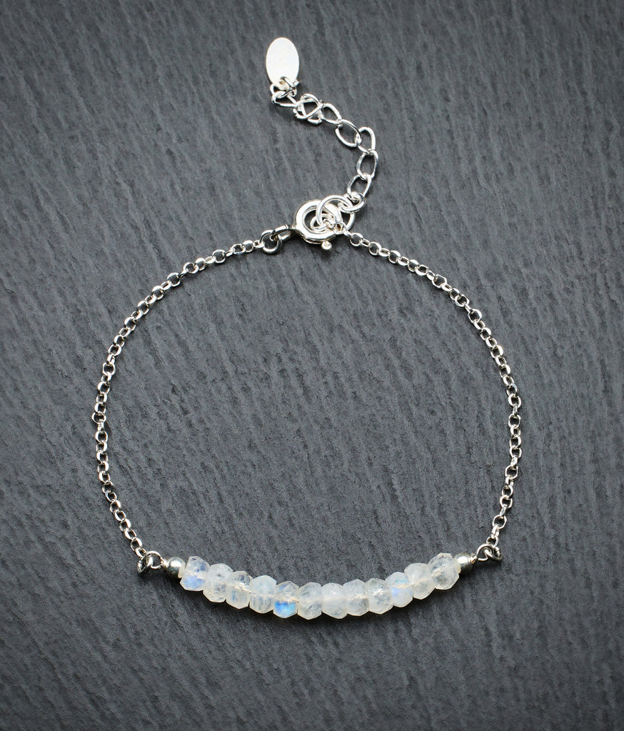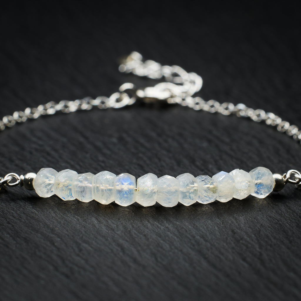 This delicate stackable bracelet features genuine AAA Grade Blue Moonstone crystals attached to the 925 Sterling Silver chain. The crystals are Faceted Rondelle Blue Moonstones about 5mm in size and may vary slightly in shape, shade, and size with internal glow and flashes of blue color. Designed to be mixed and matched!r.