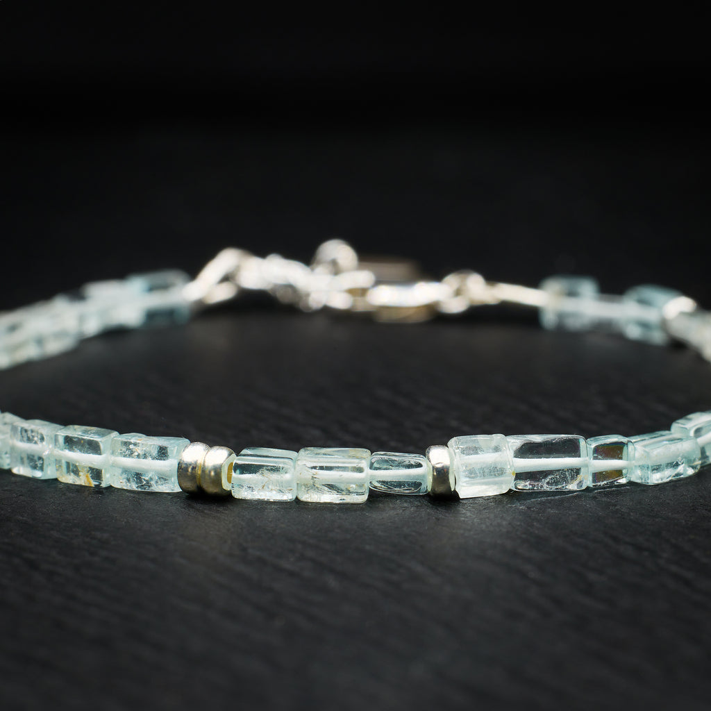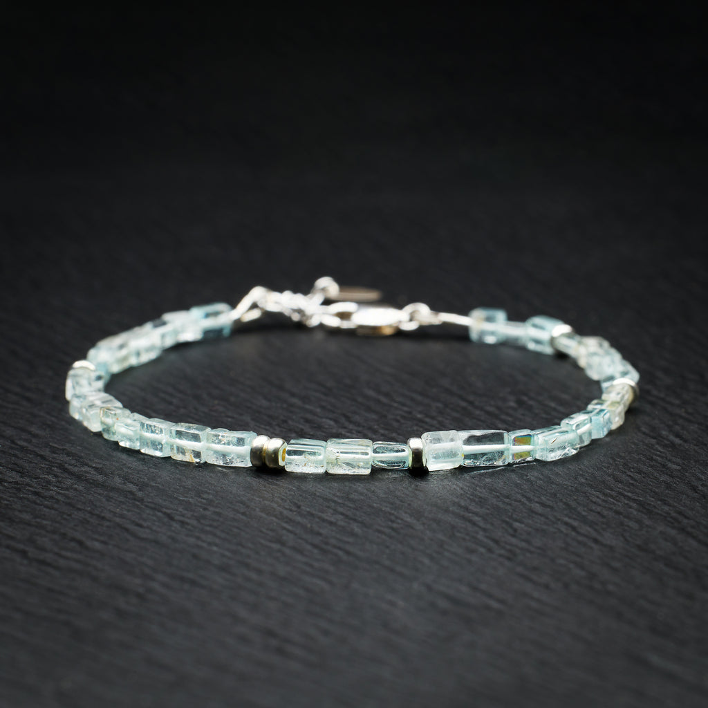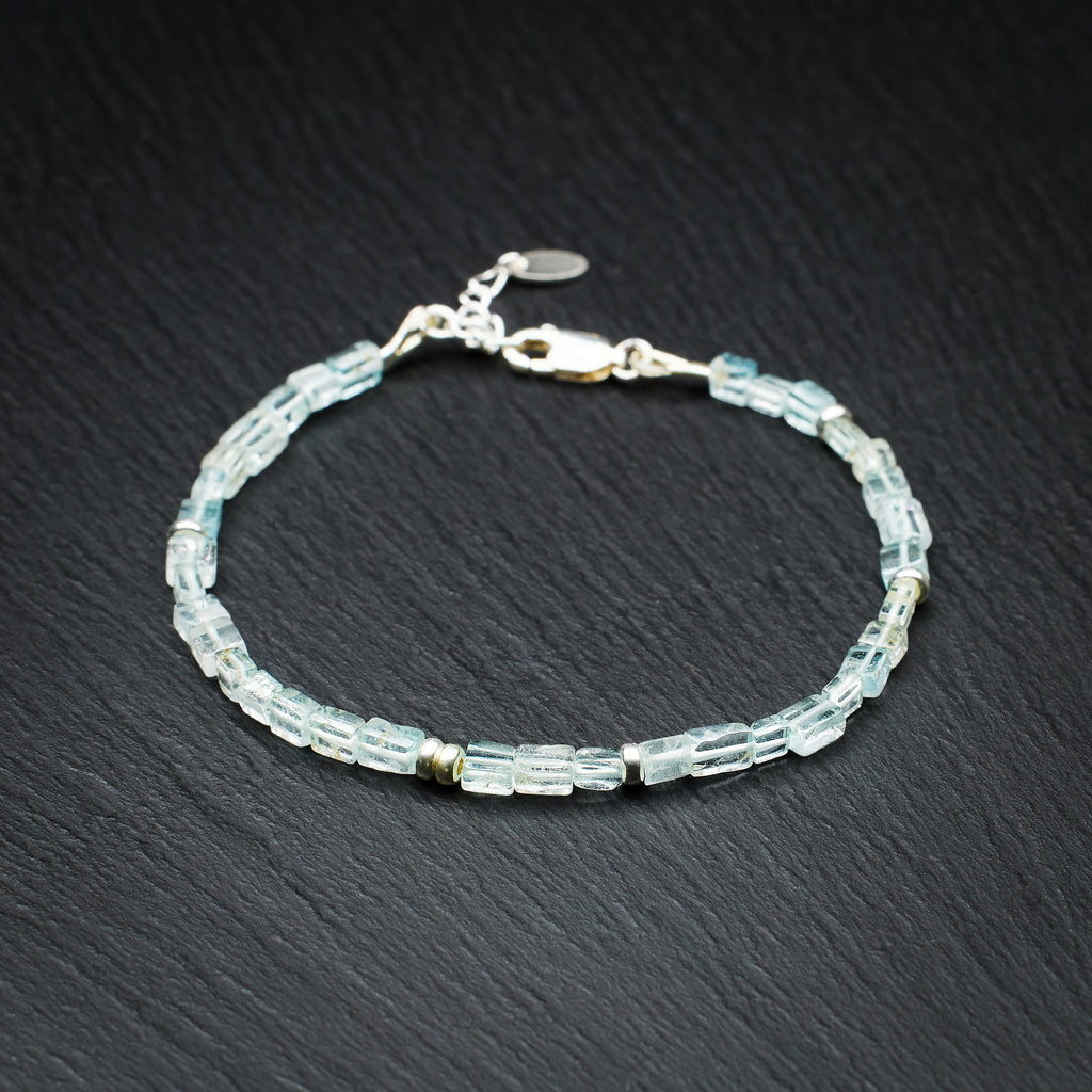 The gentle Aquamarine stackable bracelet is made of genuine High-Quality Aquamarine stones of random rectangular shapes 5-7 millimeters in size. Aquamarine crystals alternated with Sterling Silver roundel beads and accomplished by lobster clasp closing.