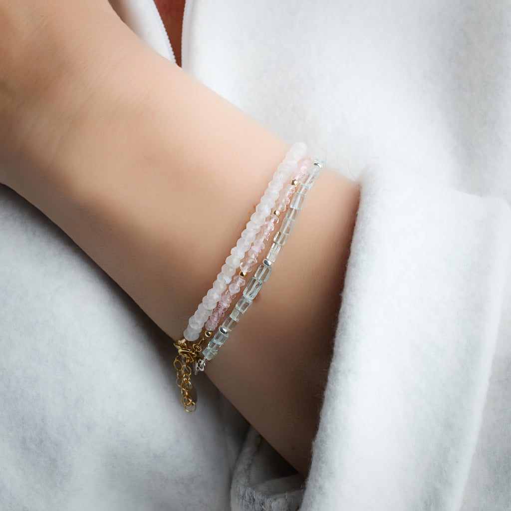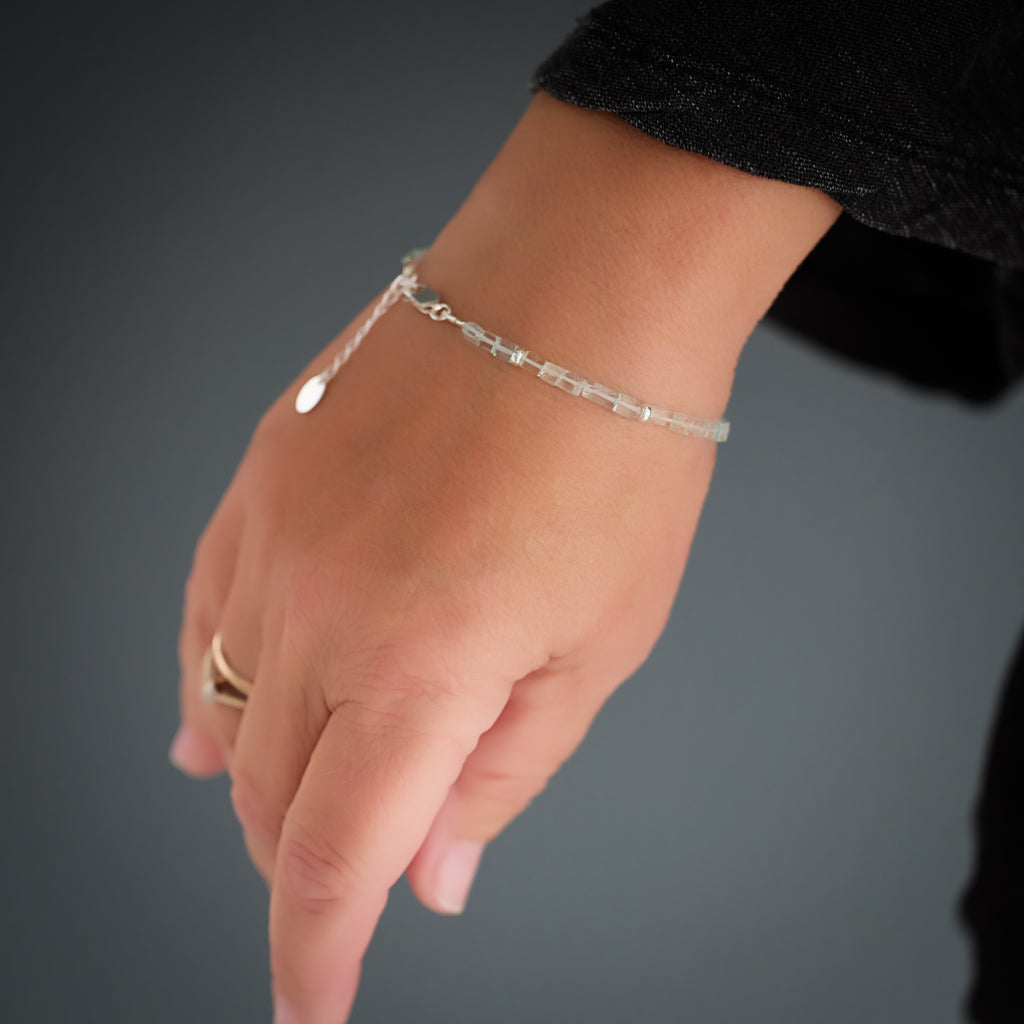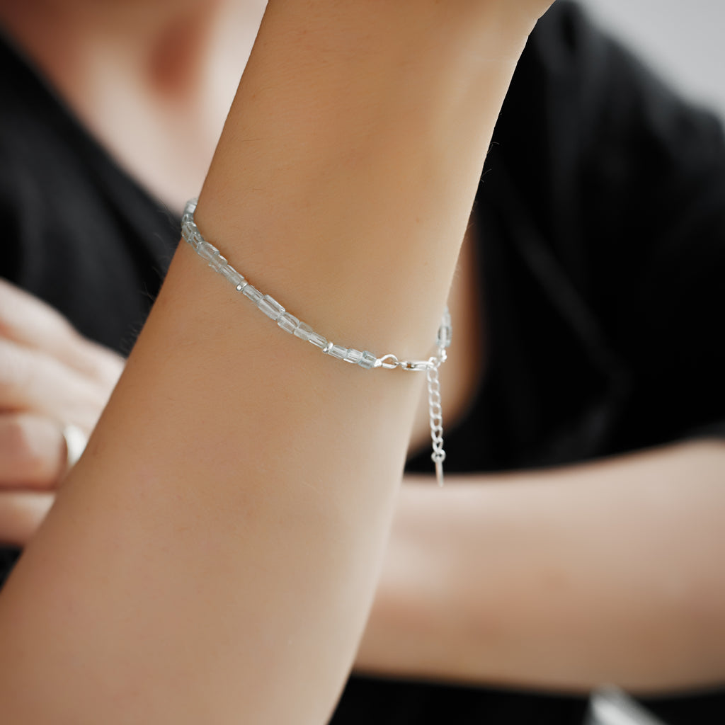 The gentle Aquamarine stackable bracelet is made of genuine High-Quality Aquamarine stones of random rectangular shapes 5-7 millimeters in size. Aquamarine crystals alternated with Sterling Silver roundel beads and accomplished by lobster clasp closing.