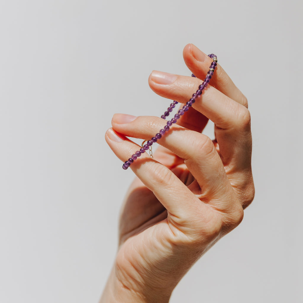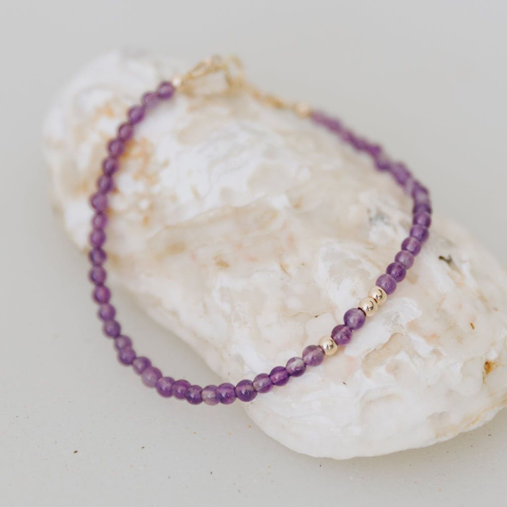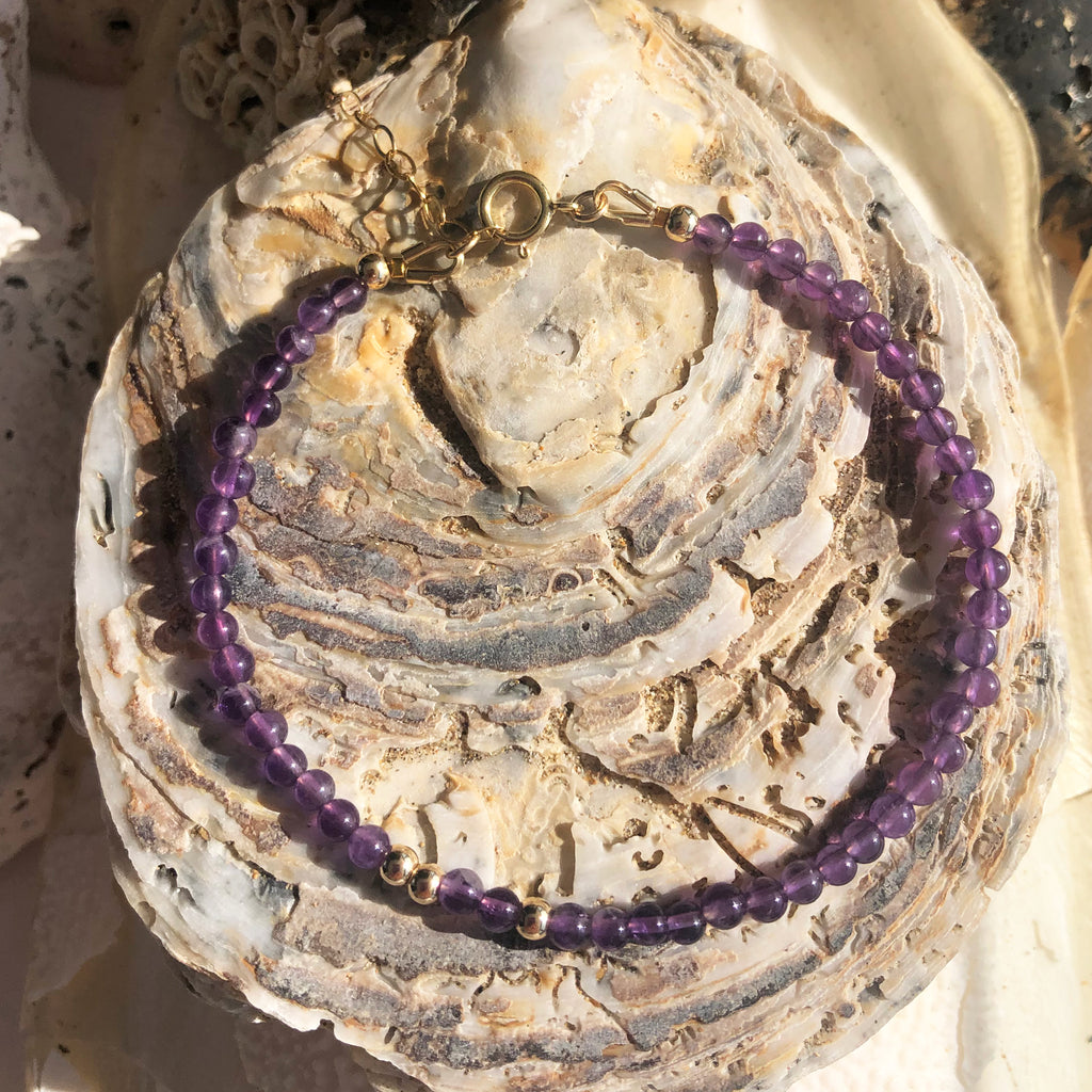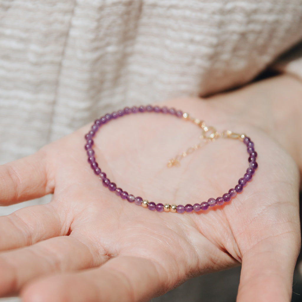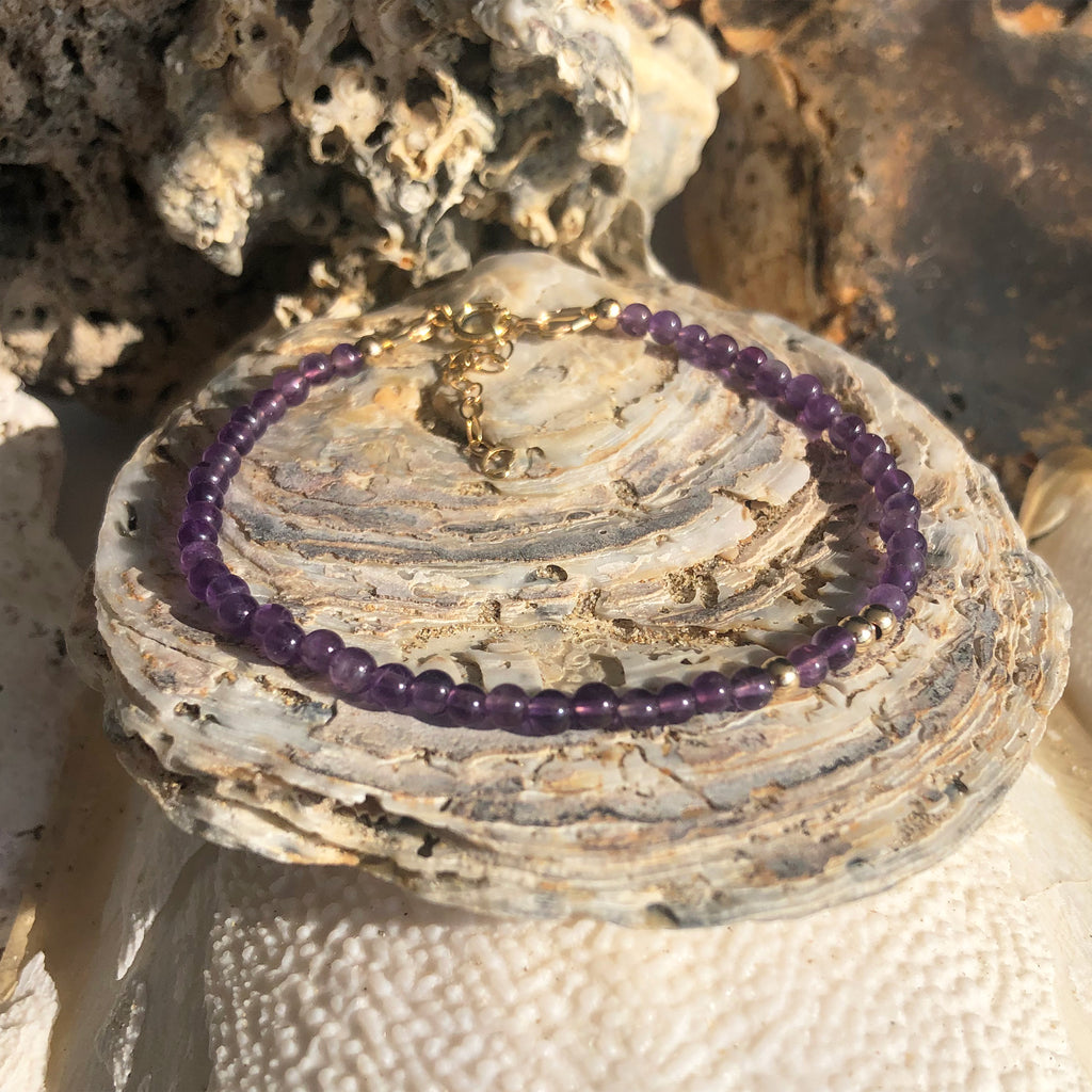 This gorgeous dainty Amethyst bracelet is handcrafted with deep color high-quality genuine Amethyst crystals 4 mm in size and 14K Gold Filled accent beads. Designed for anxiety relief. Perfect for stacking!