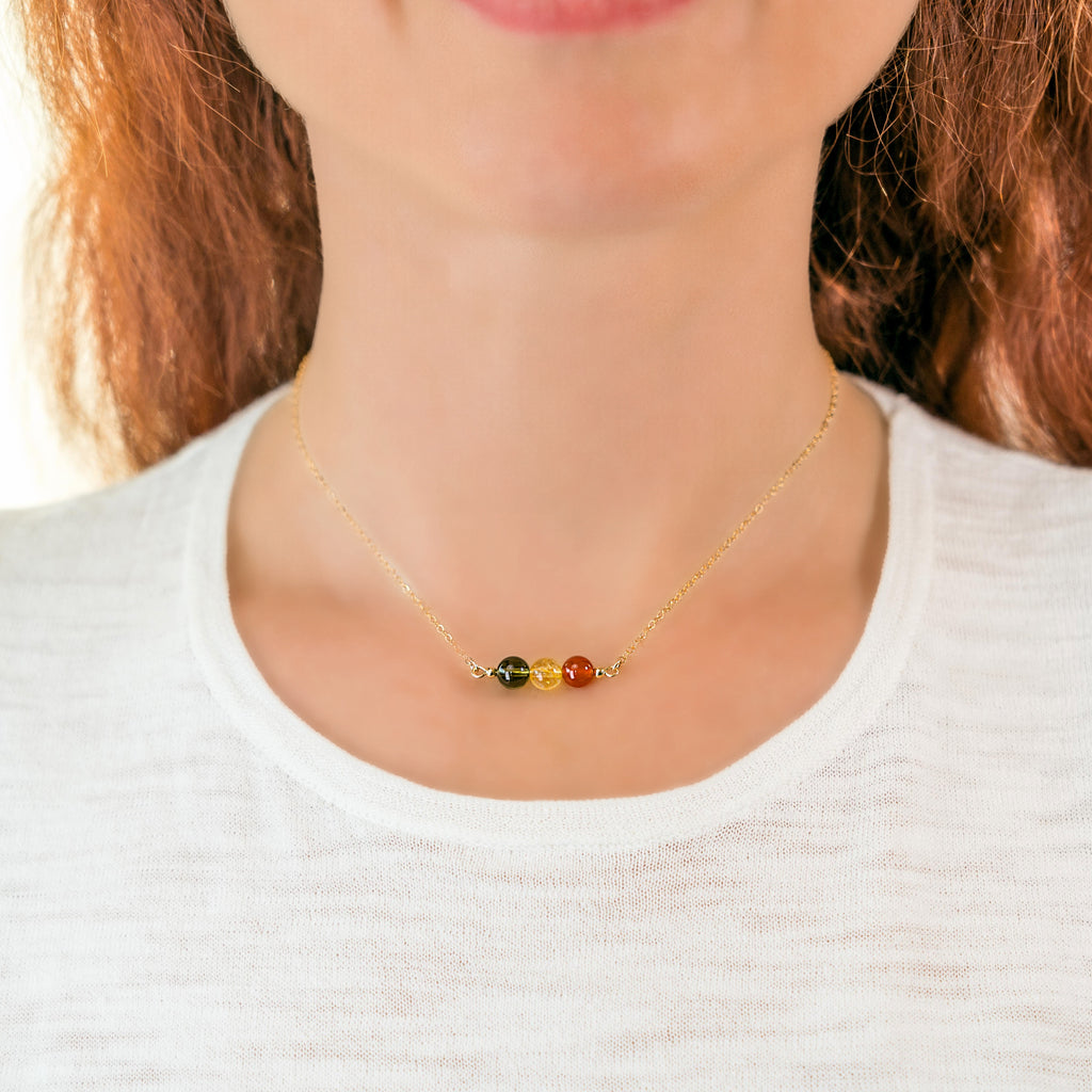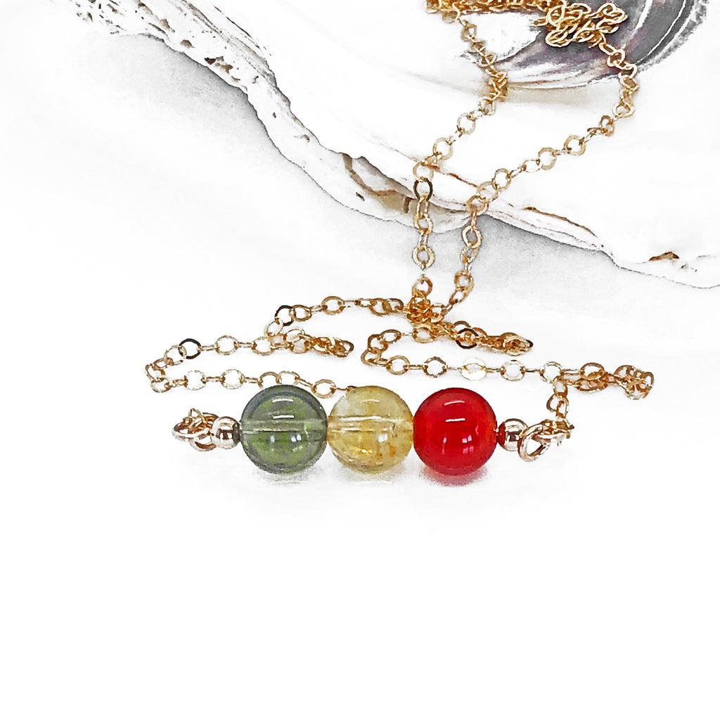 Citrine and Carnelian open the sacral chakra, unleashing your power and boosting your self-esteem. Paired together these crystals will boost you with energy, creativity, vitality, and power, unlocking the potential within you. Another great benefit of this crystal combination is that it removes self-limiting beliefs crucial to achieving success. Moldavite dramatically enhances the power of the stones combined. As powerful by themselves as they are, these crystals combined in one necklace will complement one another.