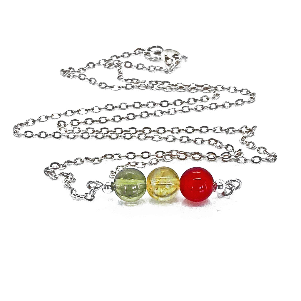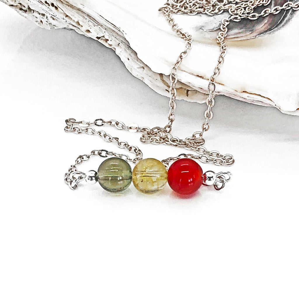 The necklace is made of AAA quality Genuine Moldavite, Citrine, and Red Carnelian 6 mm beads. These crystals combined work like a charm to bring positivity, abundance, and happiness.