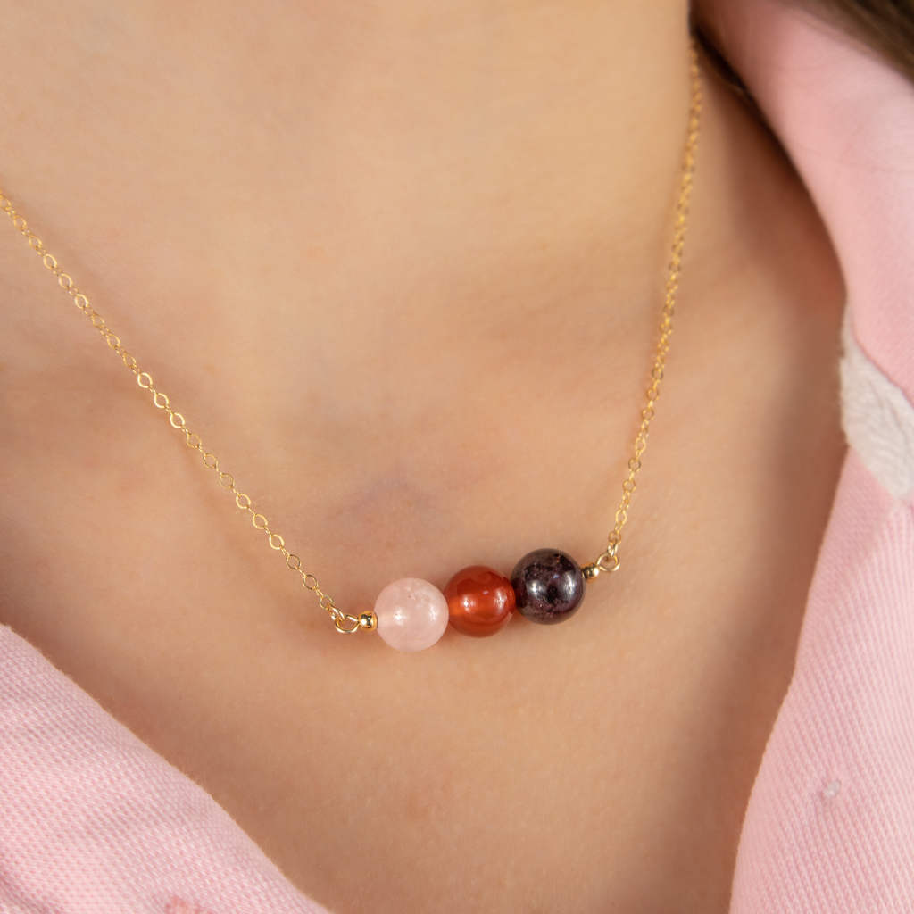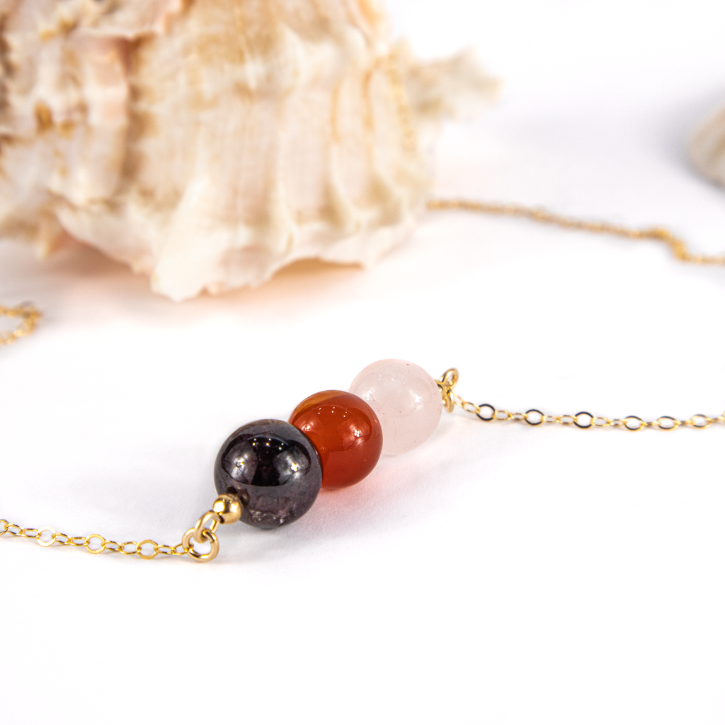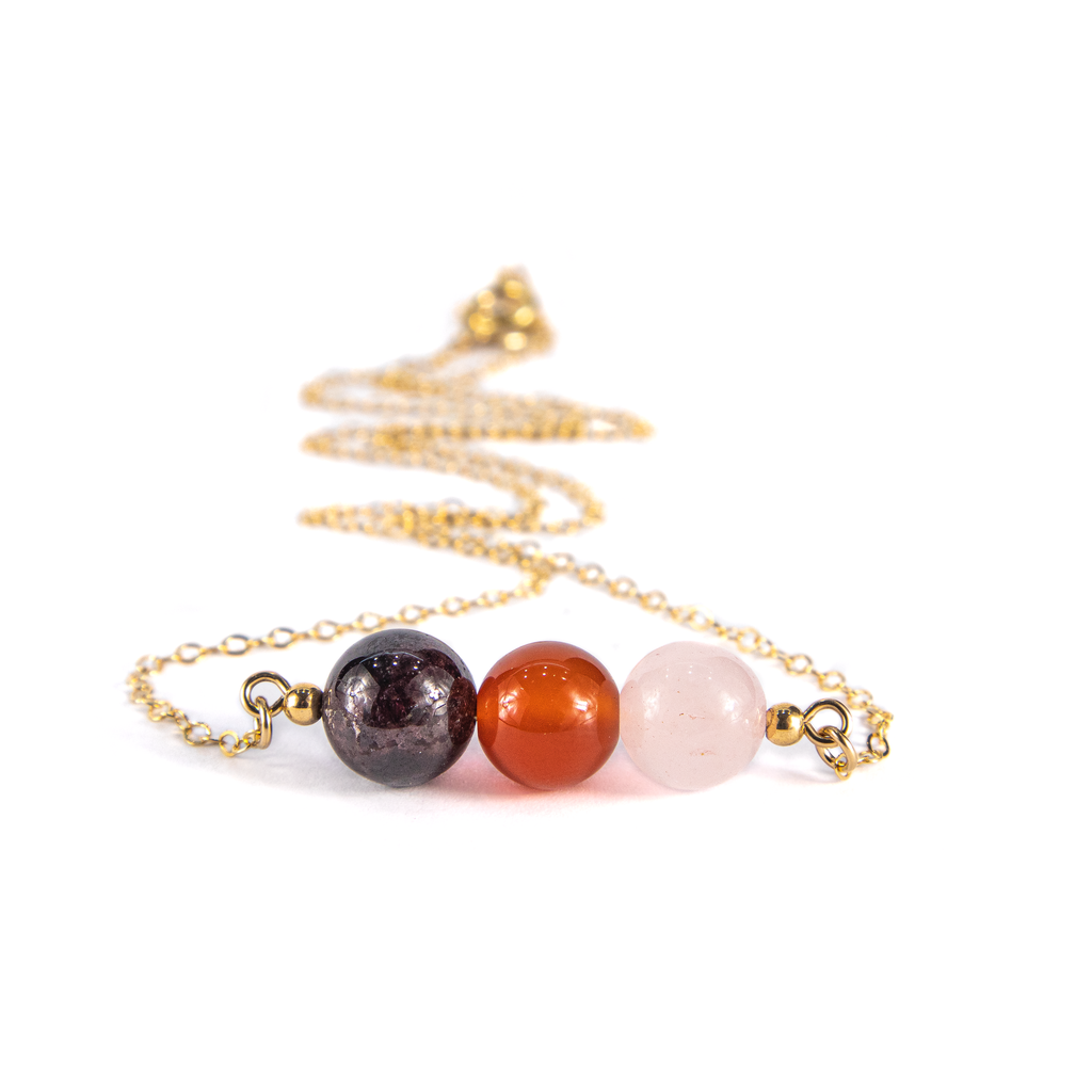 Combine Red Garnet and Red Carnelian to boost your sex drive and reignite the fire with your partner. If you find your lack of desire for sex is affecting your relationship, wearing Red Garnet and Carnelian jewelry is a good idea. Paired with Red Garnet, Carnelian is giving you confidence, a boost of energy, and renewed passion. Empowered by Rose Quartz, this duo attracts love and success and gives the wearer an extra shot of strength and courage. Combining these gemstones amplify each other’s qualities, making a unique and powerful piece of healing jewelry.