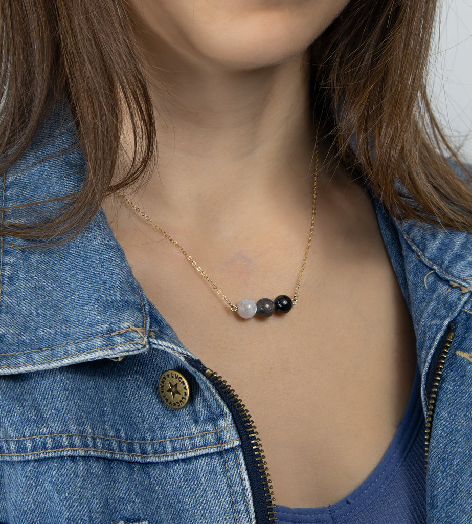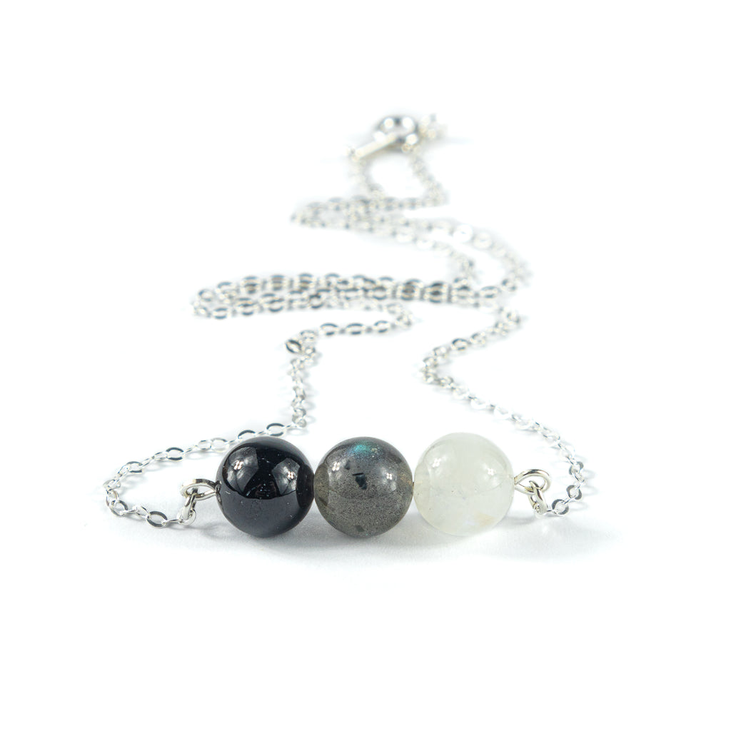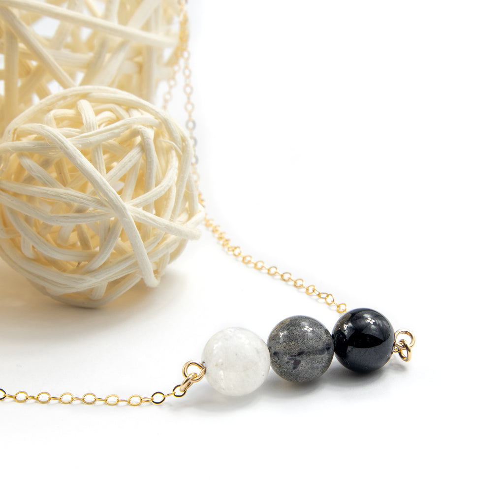 The necklace is made of 8 mm White Moonstone, Black Tourmaline, and Labradorite gemstones attached to the cable chain and closes with a Spring Ring clasp, the extra-safe lock designed to keep this piece with you all the time.