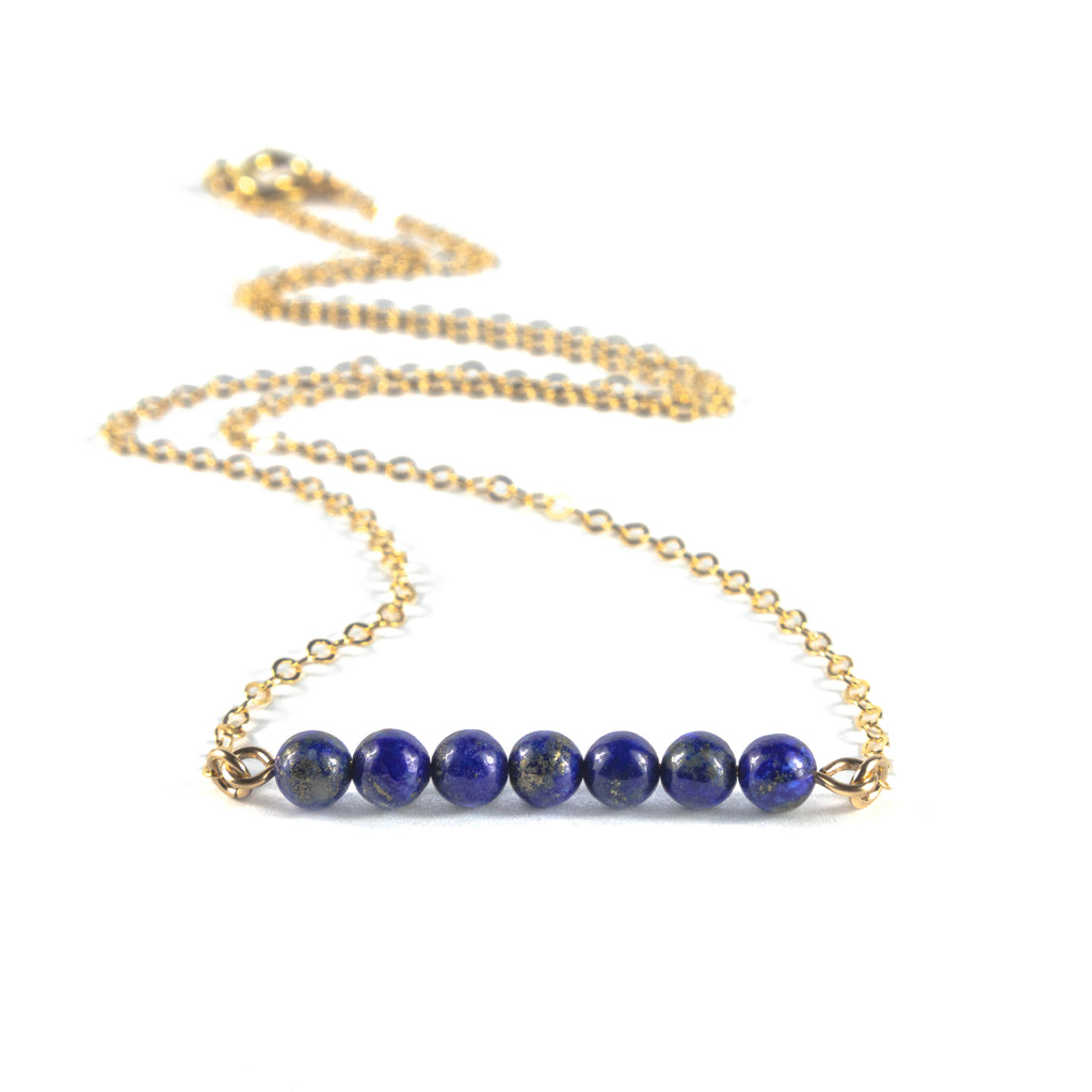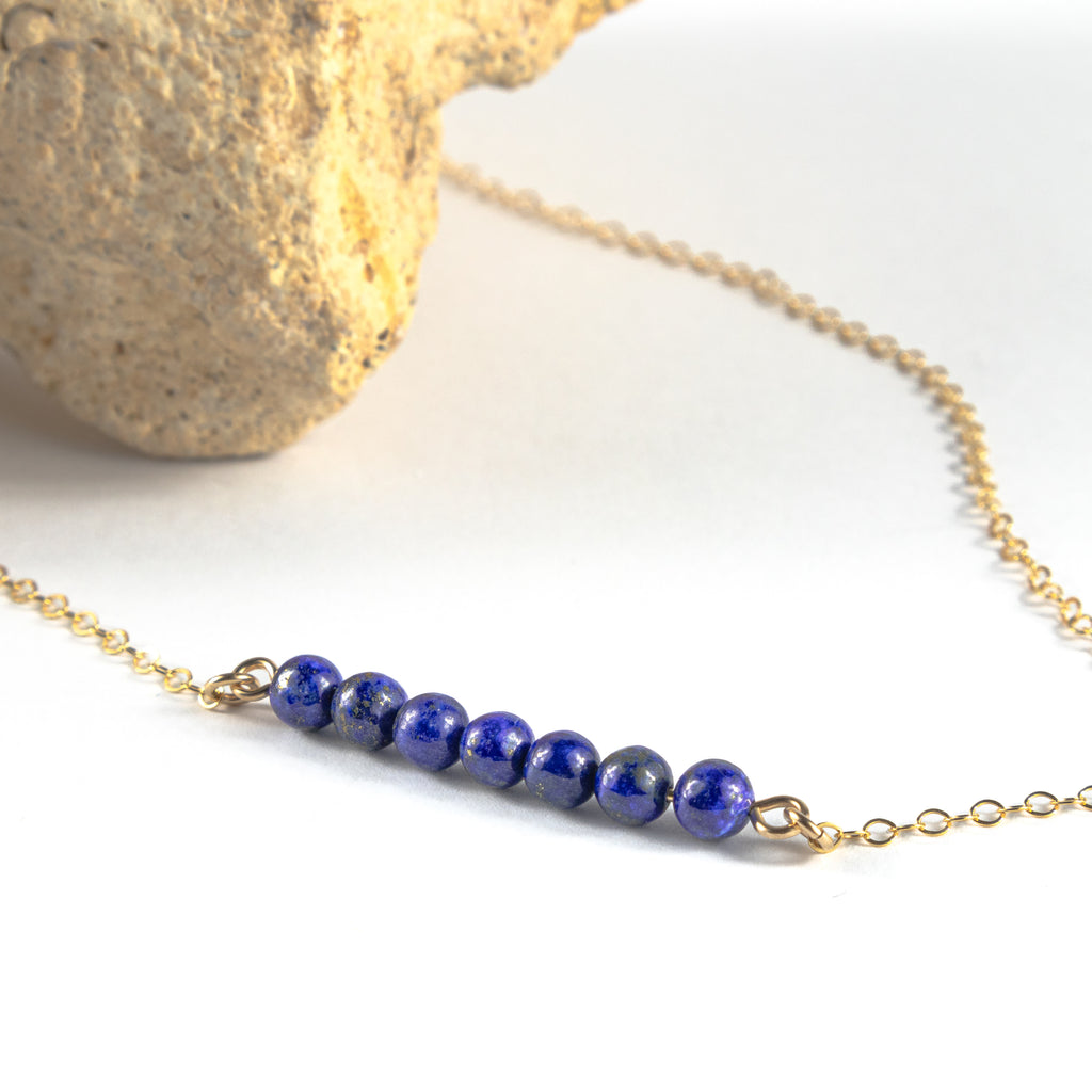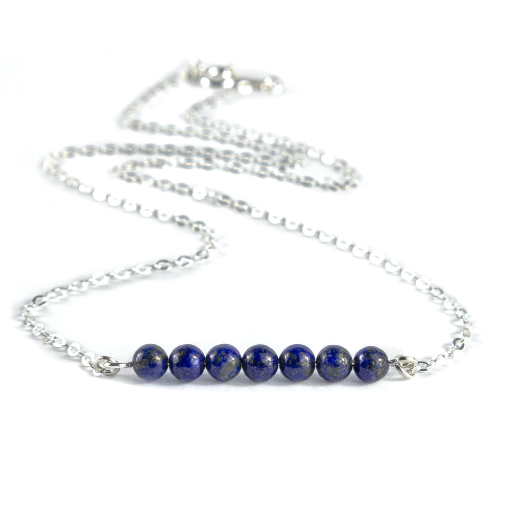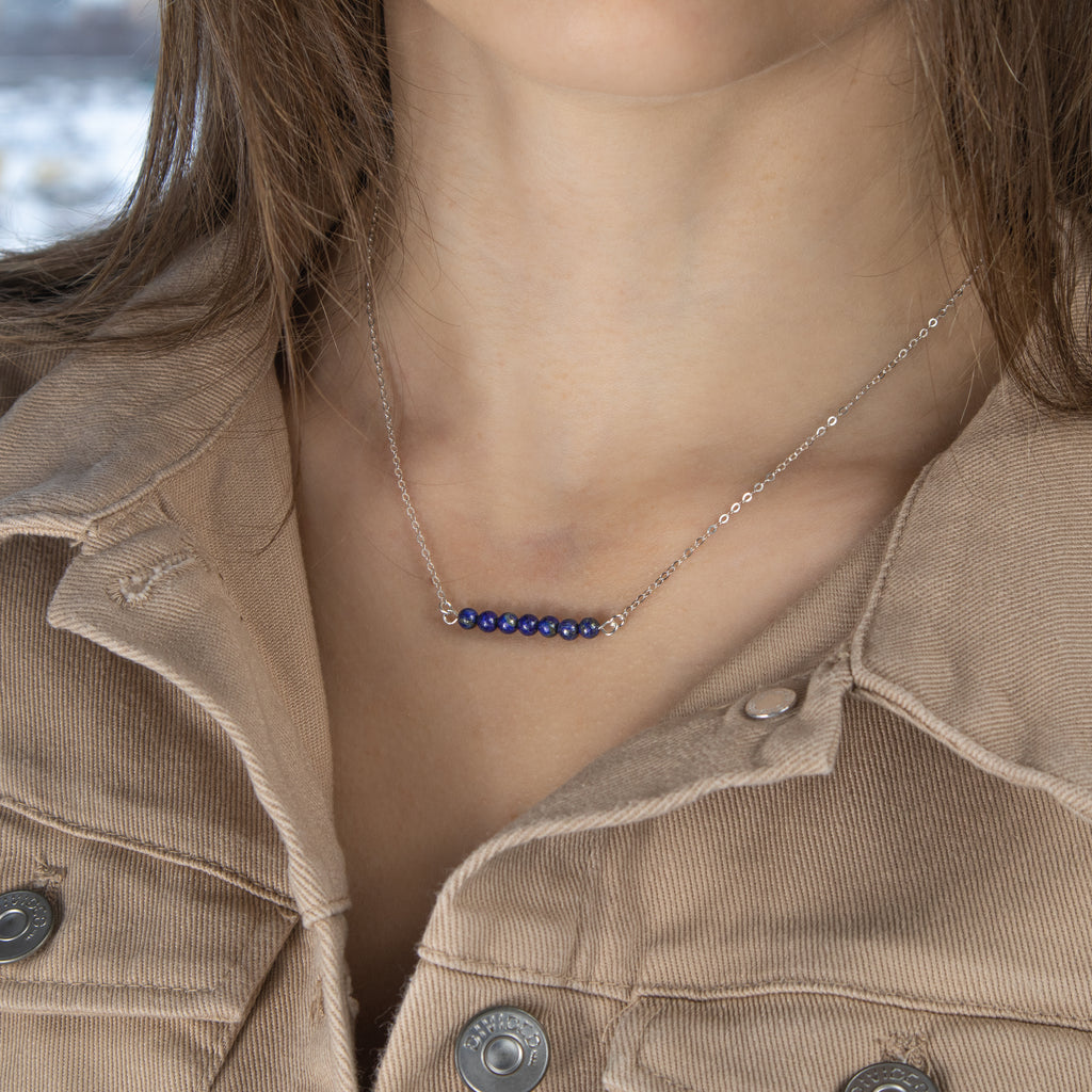 This necklace features AAA Grade 4 mm Lapis Lazuli blue beads. The bar is attached to the cable chain and closes with a Spring Ring clasp. An extra-safe lock is designed to keep this piece with you all the time.