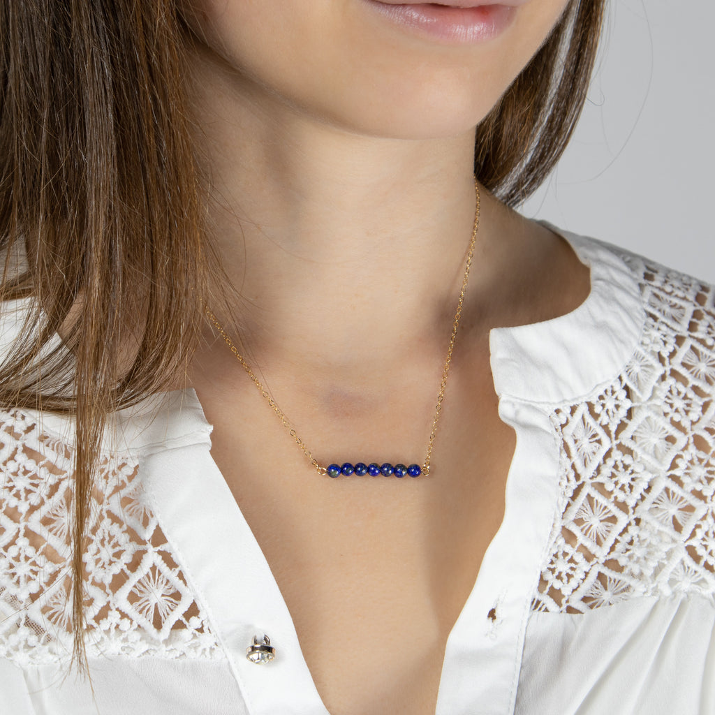This magnificent necklace is handcrafted to decorate your décolleté with sophisticated Lapis Lazuli blue hues and make you more confident about taking action, expressing what you feel, and following your inspiration.