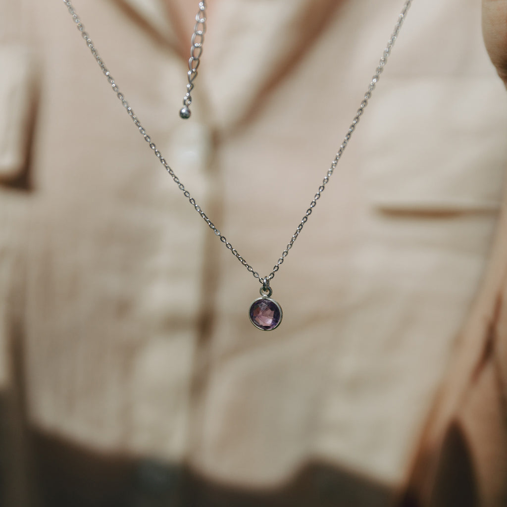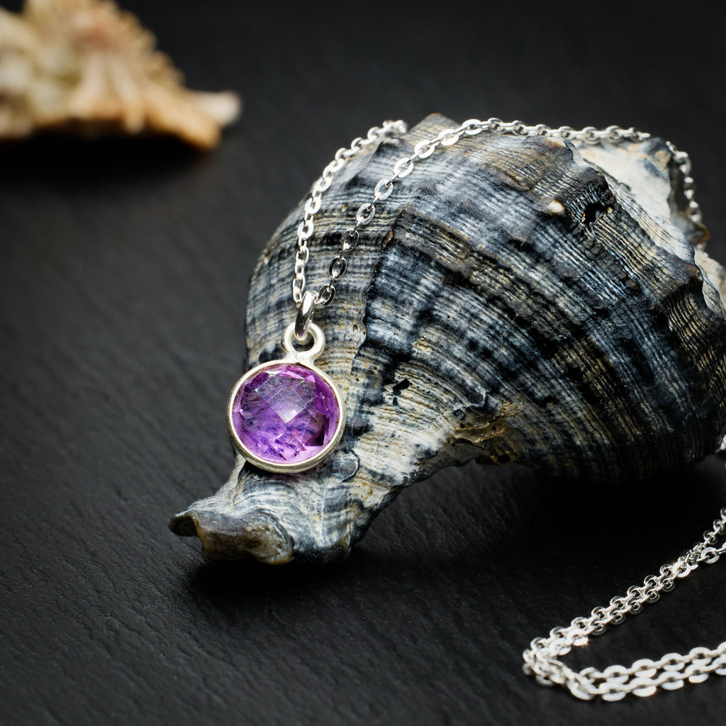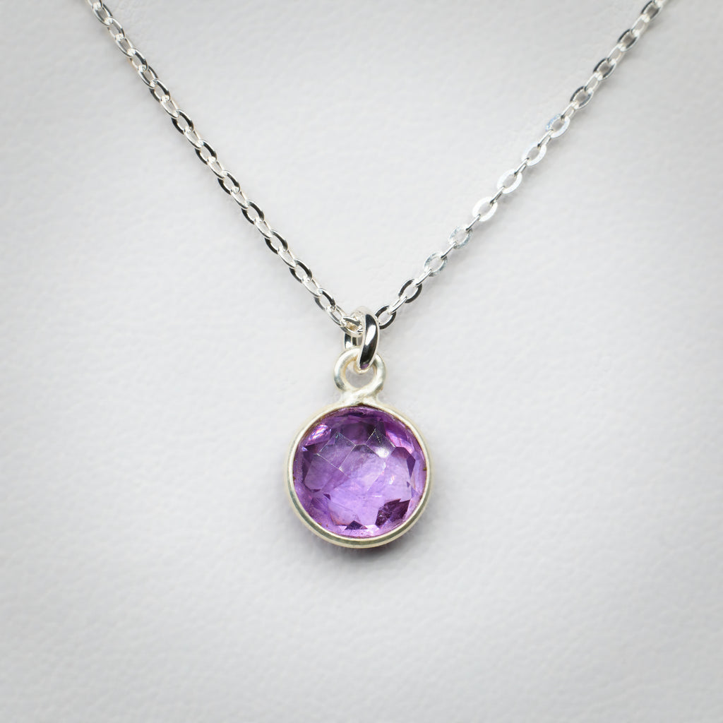 The necklace features a round 10 mm Genuine Amethyst Bezel Pendant in a 925 Sterling Silver. The necklace comes with a 925 Sterling Silver cable chain.