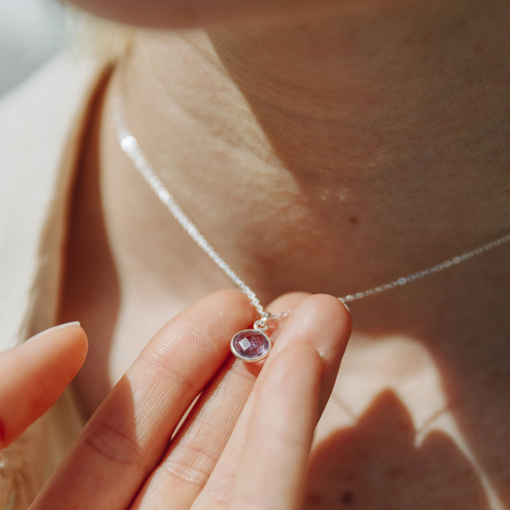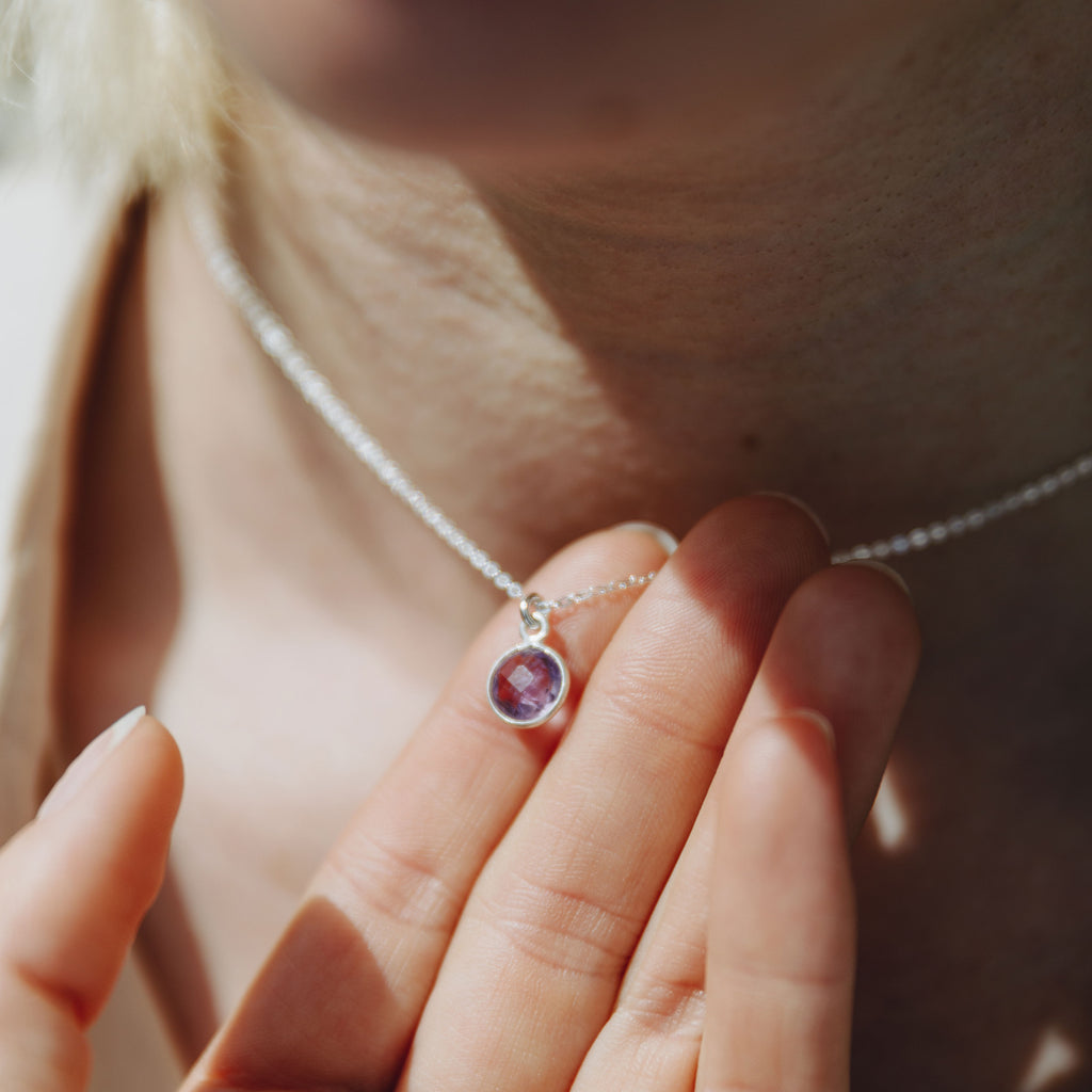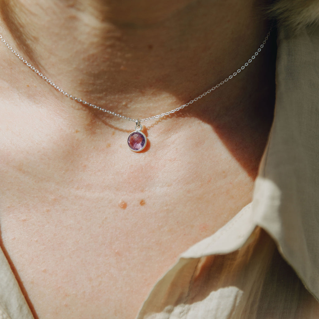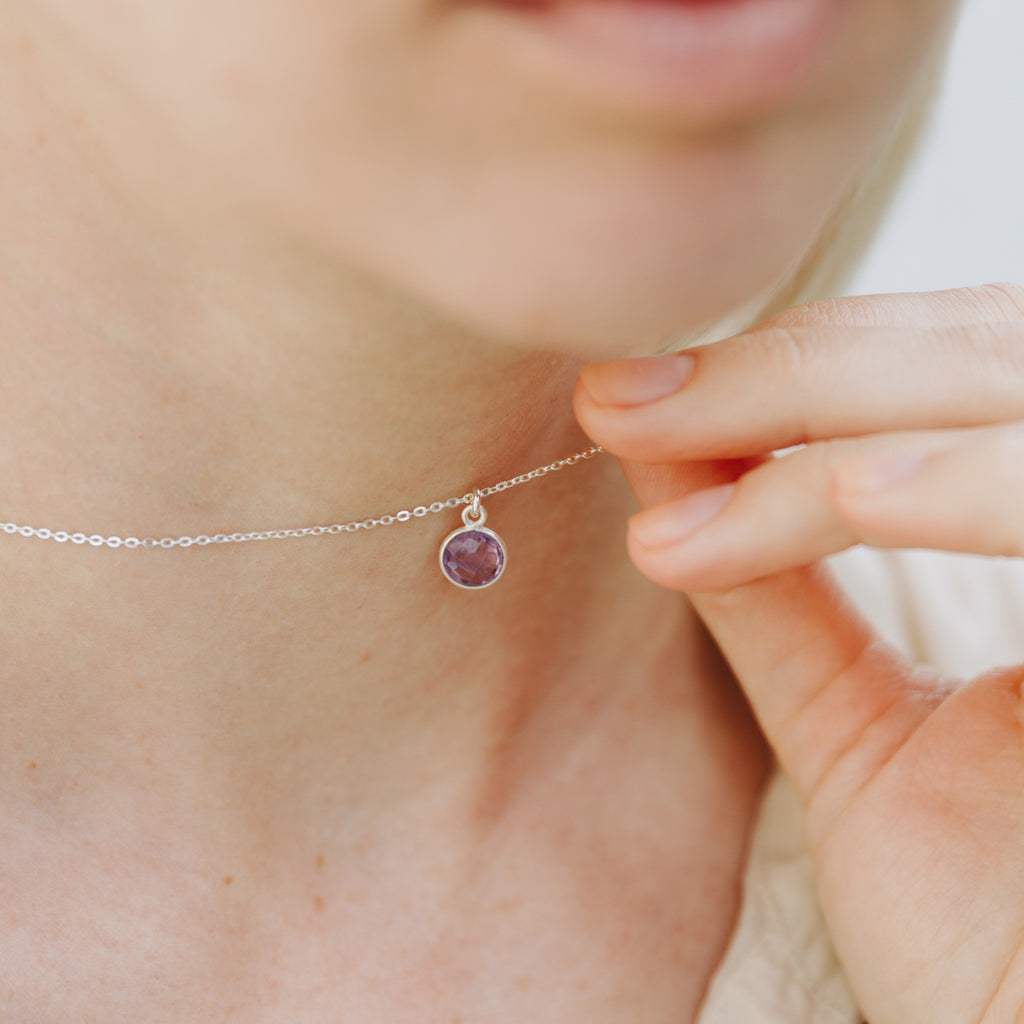 The necklace features a round 10 mm Genuine Amethyst Bezel Pendant in a 925 Sterling Silver. The necklace comes with a 925 Sterling Silver cable chain.