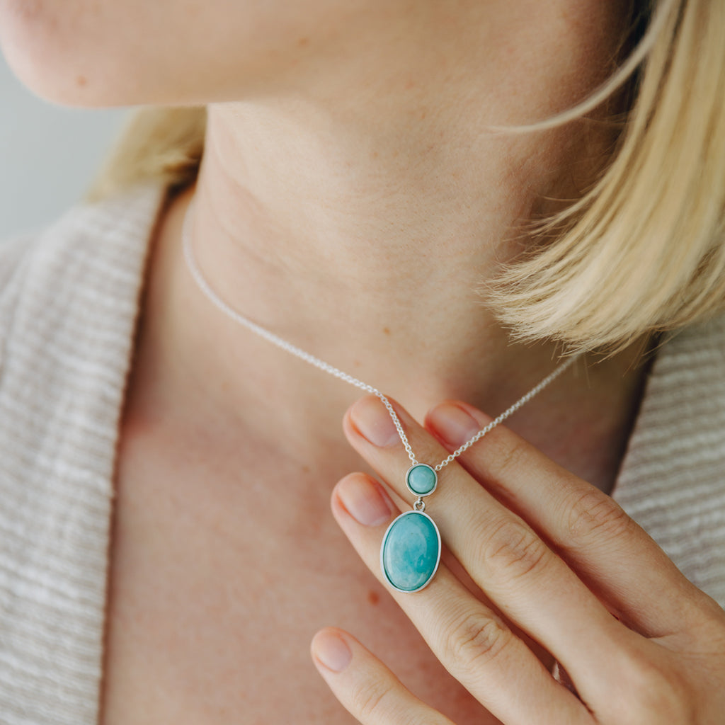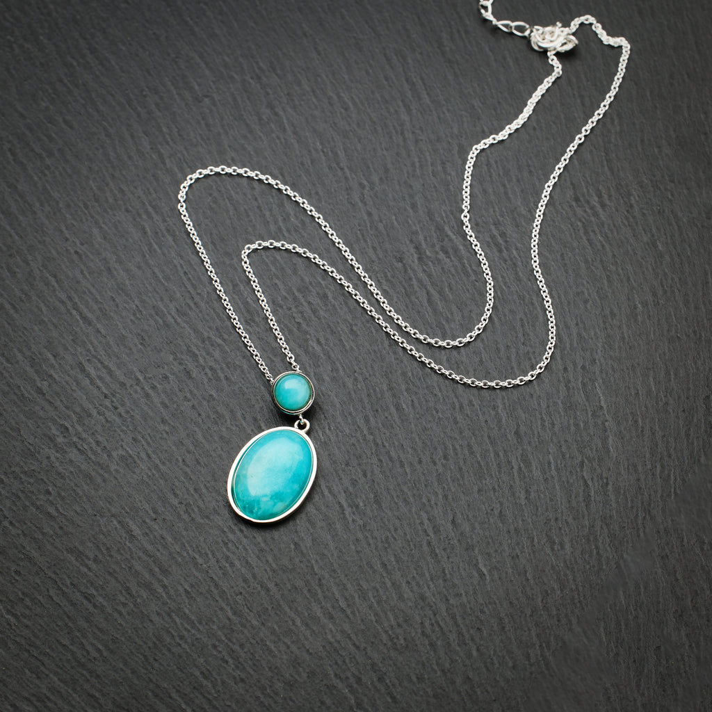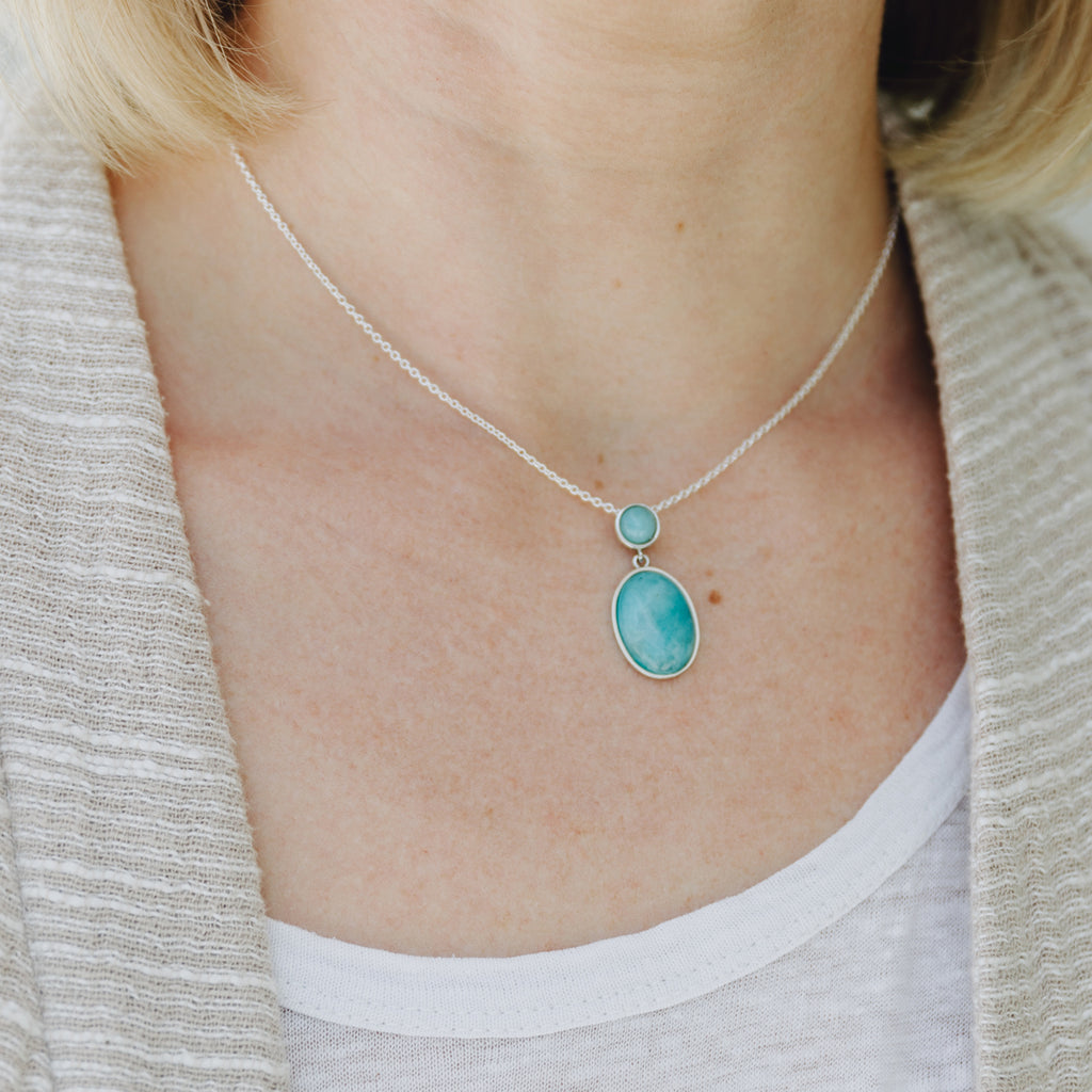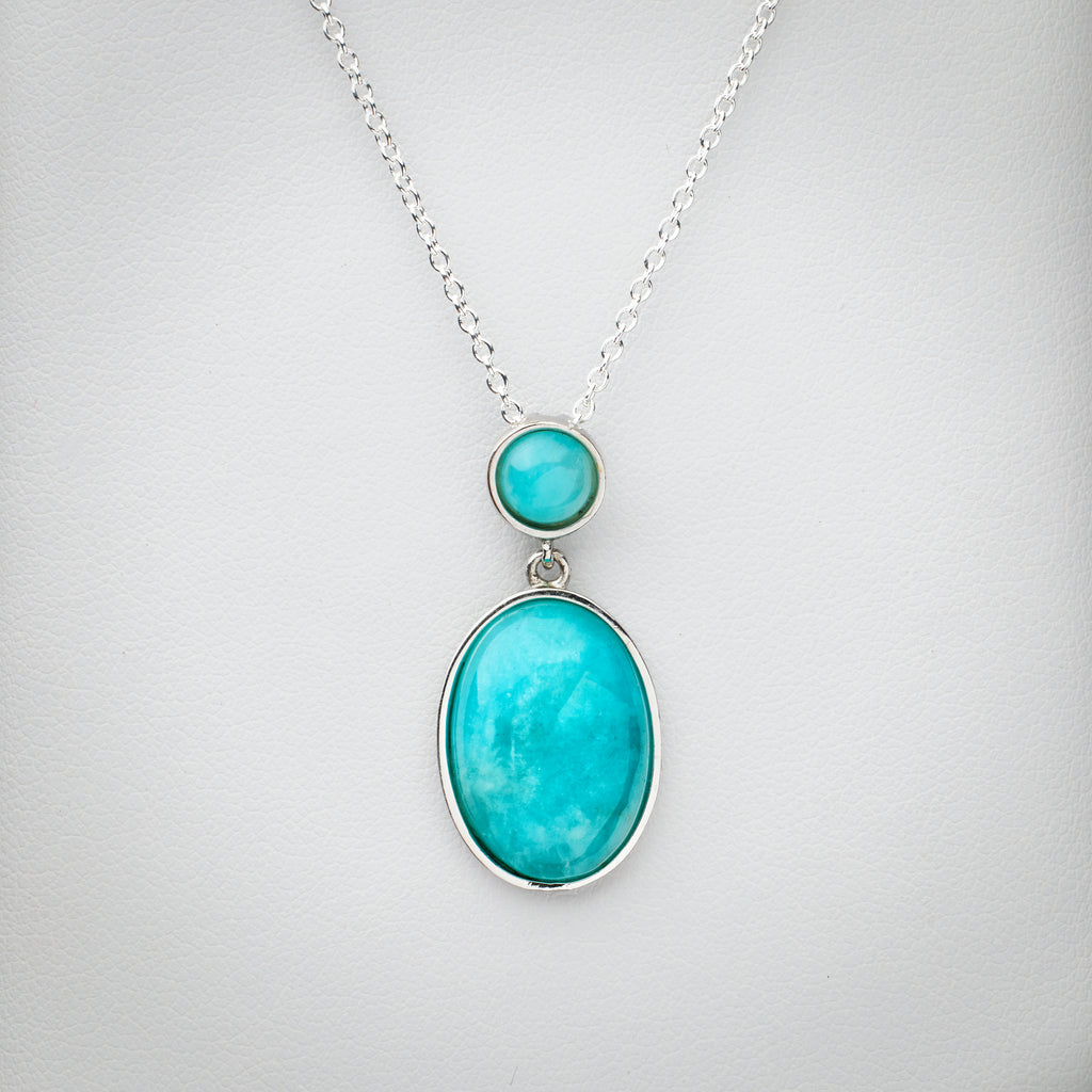 The necklace features an oval 15 x 2 mm Genuine Amazonite Bezel Pendant in a 925 Sterling Silver. The necklace comes with a 925 Sterling Silver cable chain.