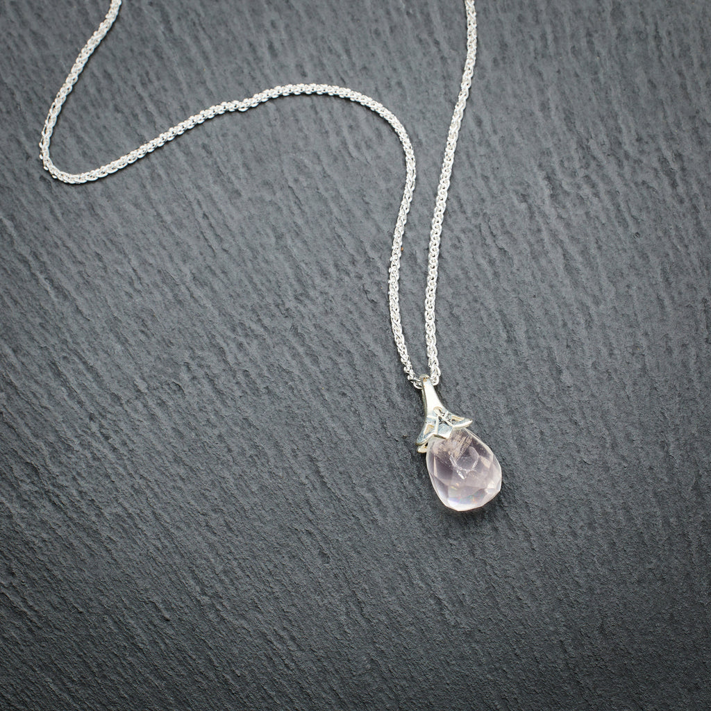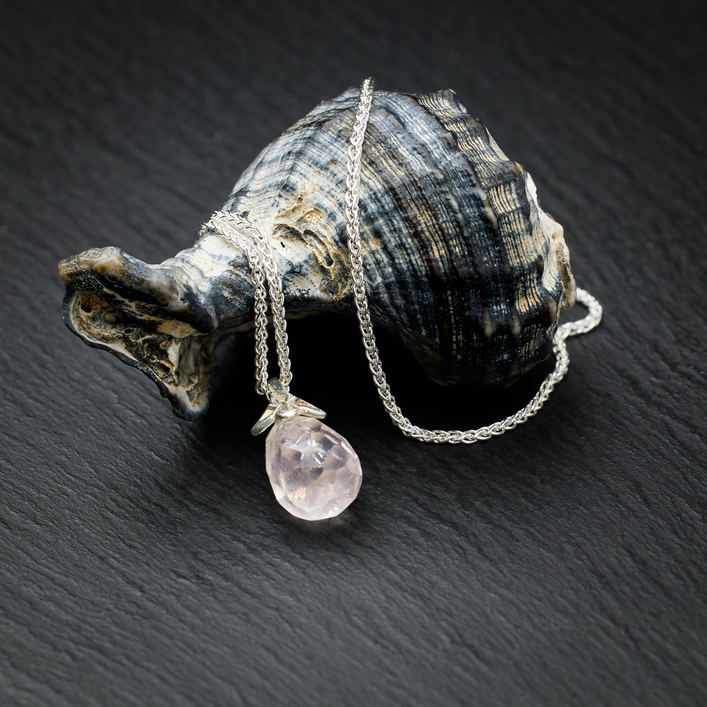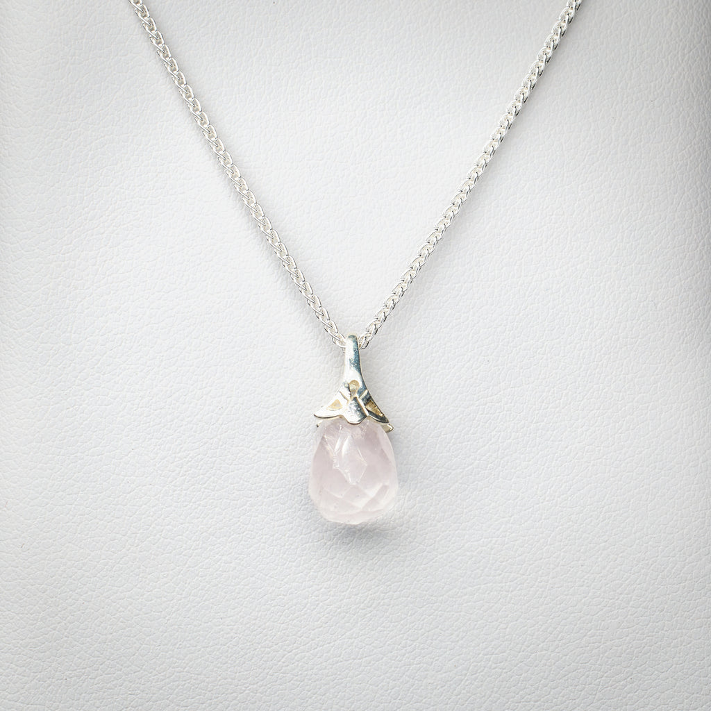 The necklace features a beautiful Genuine Rose Quartz faceted tea drop briolette pendant. The briolette is 8 x 13 mm in size. The necklace comes with a 925 Sterling Silver chain.