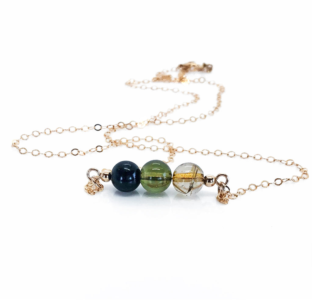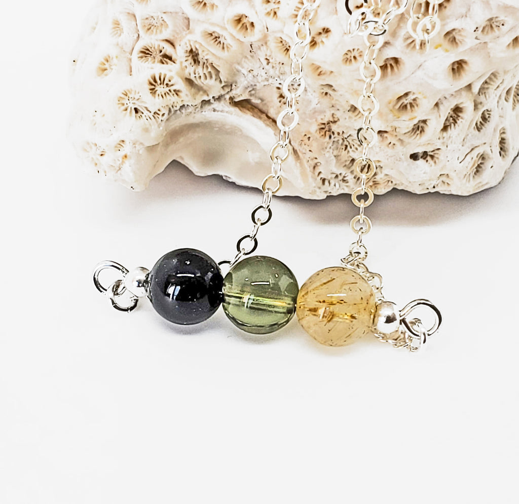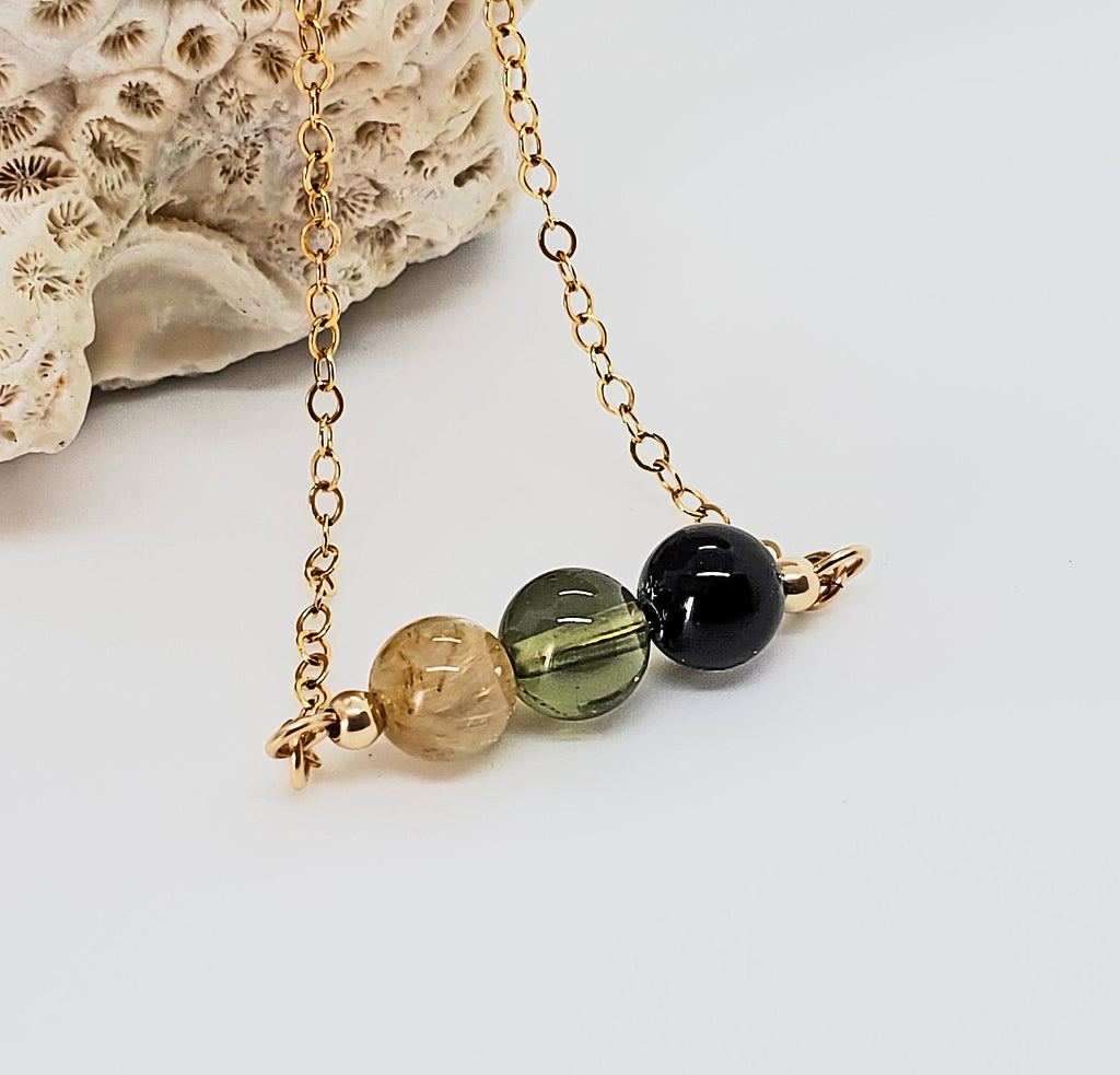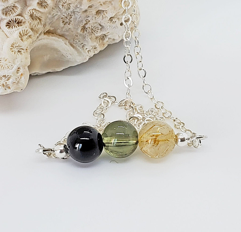 The necklace features AAA Grade Genuine Moldavite, Rutilated Quartz, and Black Tourmaline 6 mm beads. The gemstones attached to the cable chain close with a spring-ring clasp.